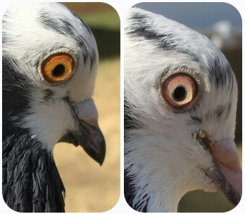 Explaining the eye colors, Brian McCormick wrote: There are only two eye colors – pearl and orange. Orange is dominant to pearl. Orange can produce pearl but pearl to pearl cannot produce orange. Bull eye is simply incomplete meiosis of the pigment near the eye, often times in such a way that it responds and reproduces like a marking. Bull eye birds are either pearl or orange under their “sunglasses”.