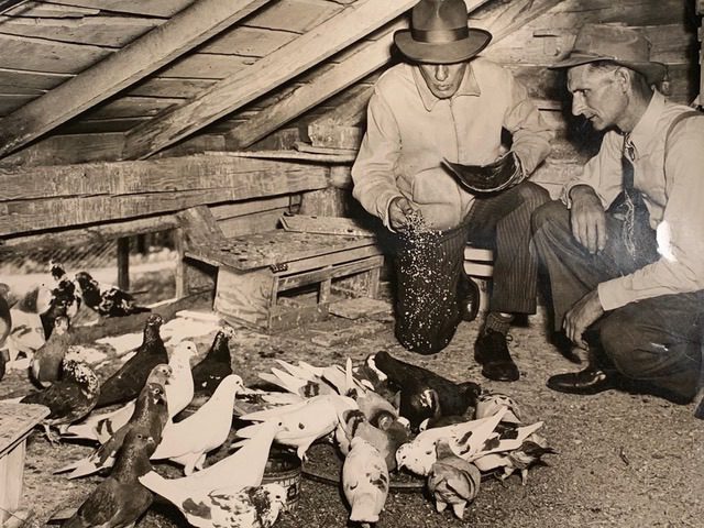 Ray Perkins (left) looking over his birds with William Pensom[/caption]